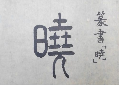 2つ目は篆書の「暁」が題材。古い「暁」には「土」が3つあるのが特徴です。偏を丸くして左側に大きく書き、旁は縦に凝縮して横長の作品に仕上げました。
