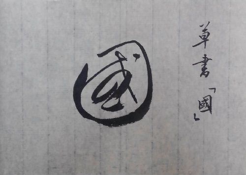 題材は漢字の「国」の旧字体で「國」。書体は草書です。一般的に旧字体は画数が多いので、作品化しやすい場合が多々あります。逆に画数が多すぎて作品にならない時もありますが…。